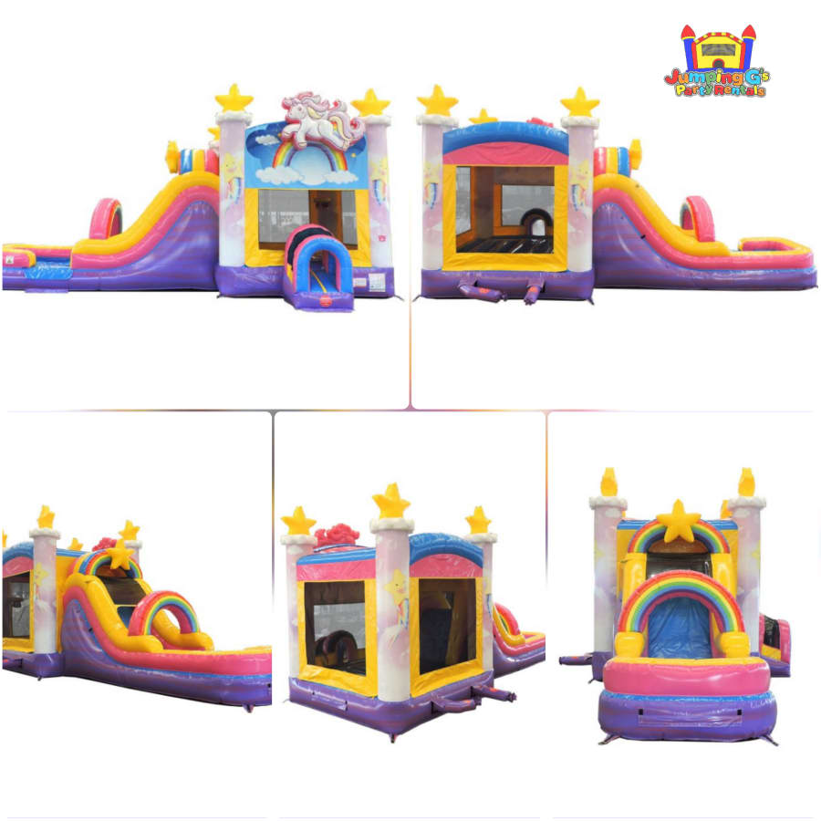 Every Little Princess wants a palace with Unicorns and Rainbows, Our Starlight Palace Bounce House Combo features a Bounce area, Climb area and a Slide down to a splash landing. The Starlight Palace can be used Wet or Dry and provides fun and excitement to both kids and adults of all ages.