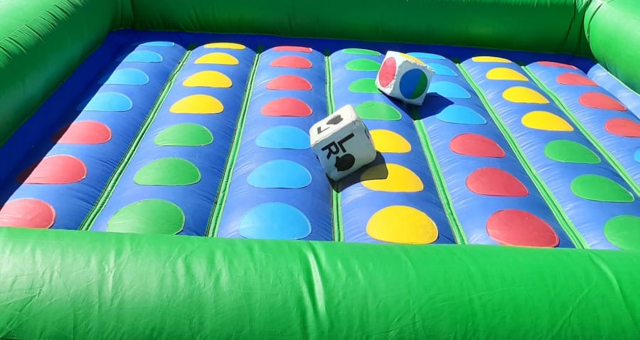 The Twister Inflatable features a pair of giant dice that take the place of the traditional spinning wheel to instruct players to put their right hand on red or left foot on green. The 13' L x !3' W game board" allows for plenty of room for players to mix it up.