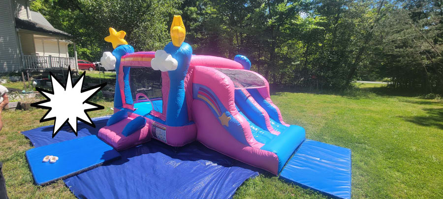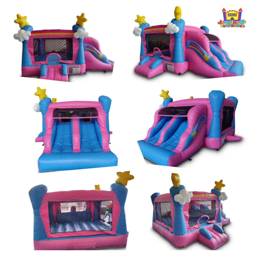 The Mini Enchanted Bounce House Combo has a Bounce area, Climb area and Dual Lane Slide. This 13.3'L x 11'W. The Mini Enchanted Bounce House Combo can comfortably accommodate up to Four participants at 60lbs each. This Unit is for Toddlers only.