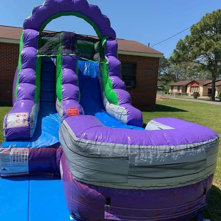 The 12' Purple Marble Slide measures at 23' L x 9' W x 13.5' H. We would recommend a set up area of at least 30' L x 15' W x 14.5' H.