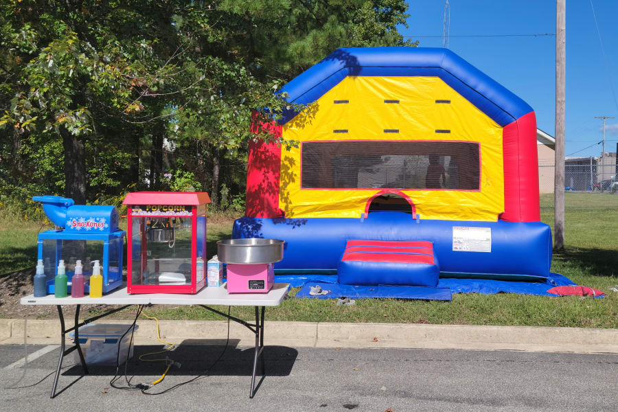 Our Bounce House-Concession Package rental Includes any available Bounce House of your choice along with a Cotton Candy Machine, a Cotton Candy Machine, Popcorn Machine and a Snow Cone Machine. Our package includes 40 complimentary servings with each concession rental.