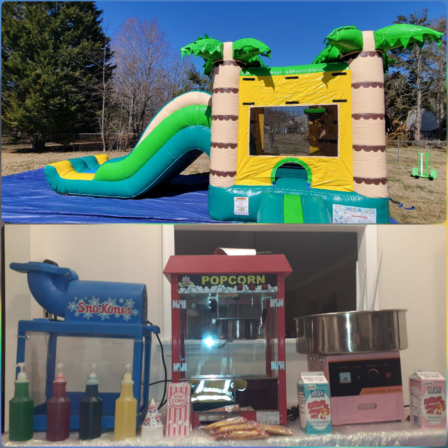 Our Bounce House with Slide -Concession Package rental Includes any available Bounce House with Slide of your choice along with a a Cotton Candy Machine, Popcorn Machine and a Snow Cone Machine. Our package includes 40 complimentary servings with each concession rental.