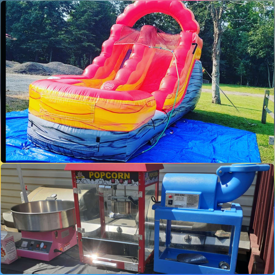 Our 12' Wet/Dry Slide -Concession Package rental Includes any available 12' Wet/Dry Slide of your choice along with a Cotton Candy Machine, Popcorn Machine and a Snow Cone Machine. Our package includes 40 complimentary servings with each concession rental.