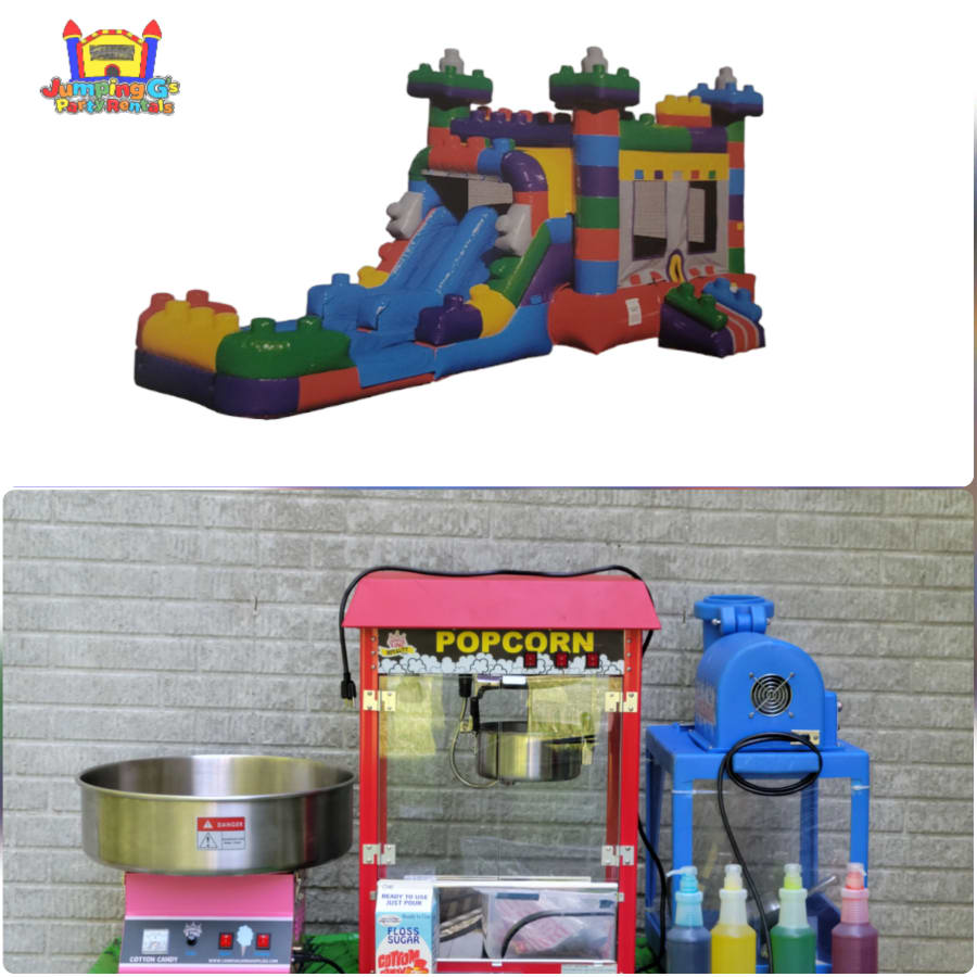 Our Wet-Dry Bounce House with Slide -Concession Package rental Includes any available Wet-Dry Bounce House with Slide of your choice along with a Cotton Candy Machine, Popcorn Machine and a Snow Cone Machine. Our package includes 40 complimentary servings with each concession rental.